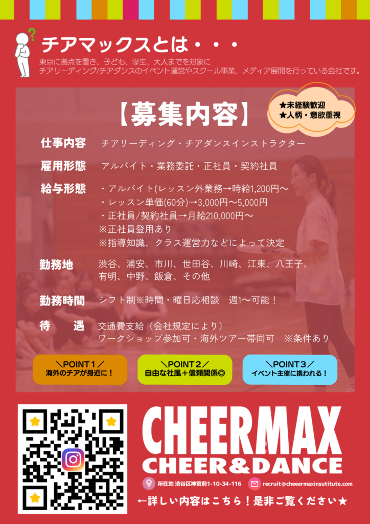 株式会社cheermax tokyoでは、事業拡大に伴い、一緒にチア業界を盛り上げてくれる仲間を募集いたします!